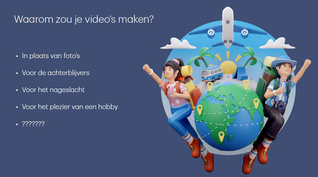 Nu er prachtige opnames gemaakt kunnen worden met smartphones, dreigt de moderne variant op de verplichte dia-avond: “Komen jullie vanavond? Zullen we alles vertellen over onze vakantie. We hebben ook wat filmpjes gemaakt….”. Het probleem: het is alleen interessant voor degenen die op vakantie zijn geweest; je moet erbij geweest zijn.