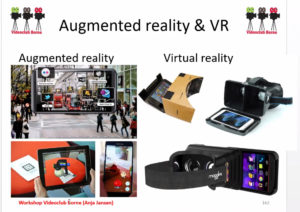 Vandaag de inhaalles van de Smartphone cursus van dit voorjaar (de les op do 26 maart was vervallen). Om zoveel mogelijk clubleden ZOOM te laten ervaren, staat deze les ook open voor de andere clubleden. Circa 10 clubleden waren vanavond dan ook aanwezig en werden weer heel wat wijzer: wat zijn er voor accessoires, wat kun je met Bluetooth, Smart-TV en andere media centers? Daarna een heel mooi overzicht (allemaal toegelicht door Anja) van kwalitatief goede apps, bijvoorbeeld over sport en fitness, gezondheid, op reis gaan, je huis inrichten en heel veel andere ‘behulpzame’ apps. Als ‘kers op de taart’ tenslotte wat voorbeelden van Virtual Reality (VR) en Augmented Reality (AR, het toevoegen van objecten aan de werkelijkheid). Beiden worden steeds meer toegepast, voor de hobby (zie bijvoorbeeld de app “VR Cosmic Roller Coaster”), maar ook bijvoorbeeld voor instructiefilms in de industrie. De kennis van Anja is ondertussen (na circa 5 jaar Smartpone cursus) ongeëvenaard en staat mooi beschreven in de twee handboeken. Veel cursisten spraken dan ook hun waardering uit: bedankt weer Anja, voor al deze handreikingen over het betere Smartphone gebruik!