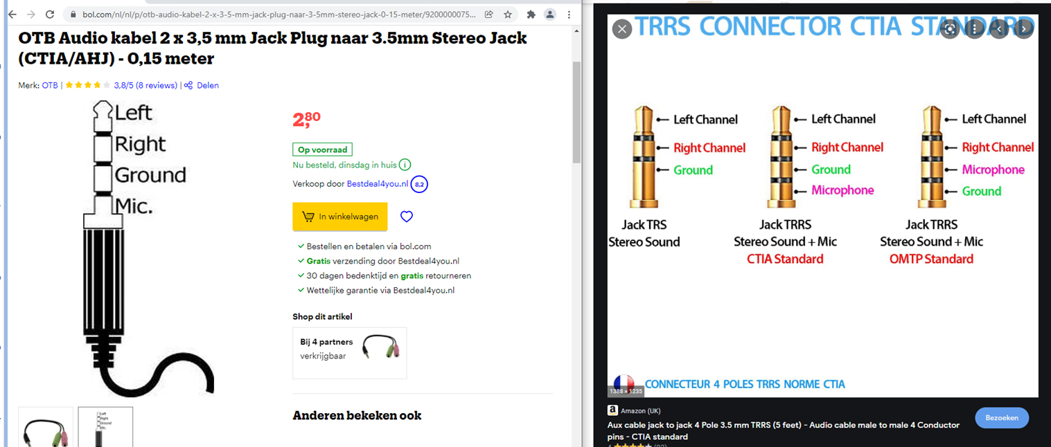 Voor gecombineerde microfoon en hoofdtelefoon stekkers zijn er verschillende standaarden: OTB en TRRS, zie hieronder.