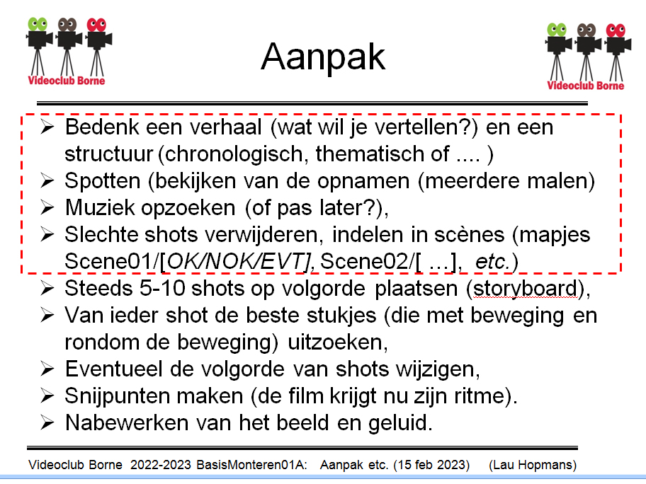 In deze eerste les behandelt Lau de algemene aanpak en hoe je van de totale film (boek) naar sequenties (hoofdstukken), scènes (alinea’s) en shots (zinnen) komt. Maak steeds kleine beeldverhaaltjes is de algemene boodschap met afwisselende beelduitsnedes: Totalen (T), Medium shot (M) en Close Ups (CU). Dat is niet zo eenvoudig, maar daarover na de pauze (over découpage) meer. Tot slot: organiseer je project netjes in mappen, maak bijvoorbeeld een map “D:\VIDEO\2023\01_BasisMonteren\…” voor deze cursus en maak verschillende mappen voor de verschillende lessen (net als voor de scènes (en binnen de scène voor goede, foute en matige shots) van je film). Dit werkt makkelijk en is ook handig voor een backup van je project!
